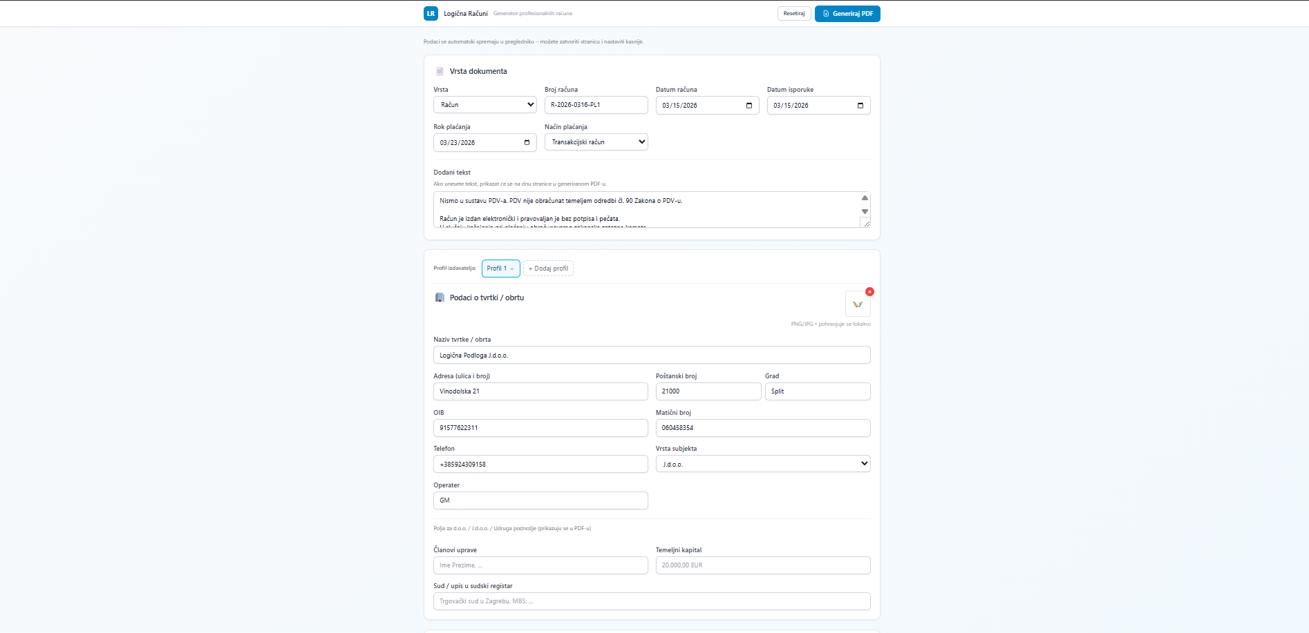 Logična Računi omogućuje brzu izradu profesionalnih računa u PDF formatu. Resetiraj podatke kad počinjete novi račun, Generiraj PDF za preuzimanje. Podaci se automatski spremaju u pregledniku — možete zatvoriti stranicu i nastaviti kasnije.