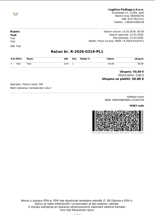 Preuzmite račun kao profesionalni PDF dokument za klijente ili arhivu.